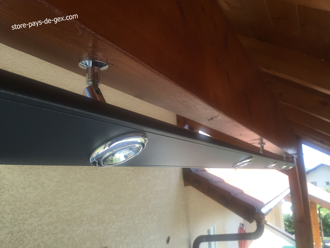 Store de terrasse coffre Stobag, toile de store Dickson, moteur radio Somfy et rampe d'éclairage Somfy | Store banne coffre "STOBAG" de terrasse, qualité Suisse, en couleur gris marron, installé, posé et monté avec une pose professionnelle et spécifique sous chevrons. En plus des supports spécifiques les chevrons ont été renforcés et doublés. Pour plus de confort, la rampe d'éclairage "SOMFY" avec variateur de lumière en couleur gris anthracite illumine la terrasse de nuit. Une télécommande "Modulis RTS" de chez "SOMFY" permet la manoeuvre du store coffre et le pilotage de la lumière. |